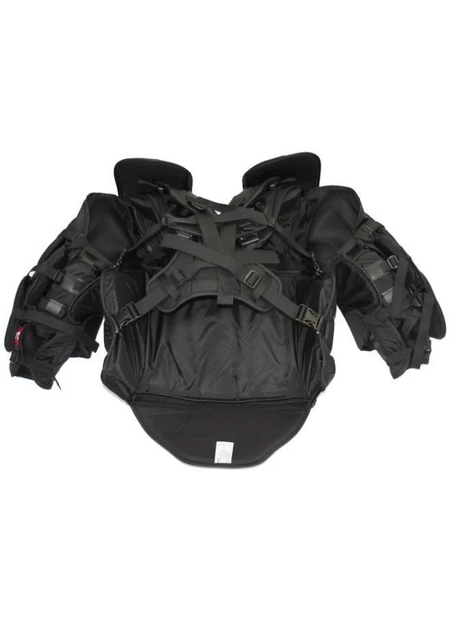 - Air-cell cushioned chest pad with “Shock-Shield” sternum plate and lower chest panel.